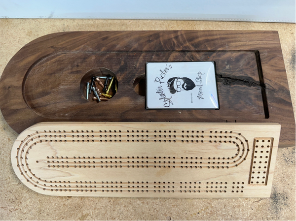 This is a 2 piece cribbage board set. Set comes with a custom set of Splinter Picker's playing cards and metalic pegs.
